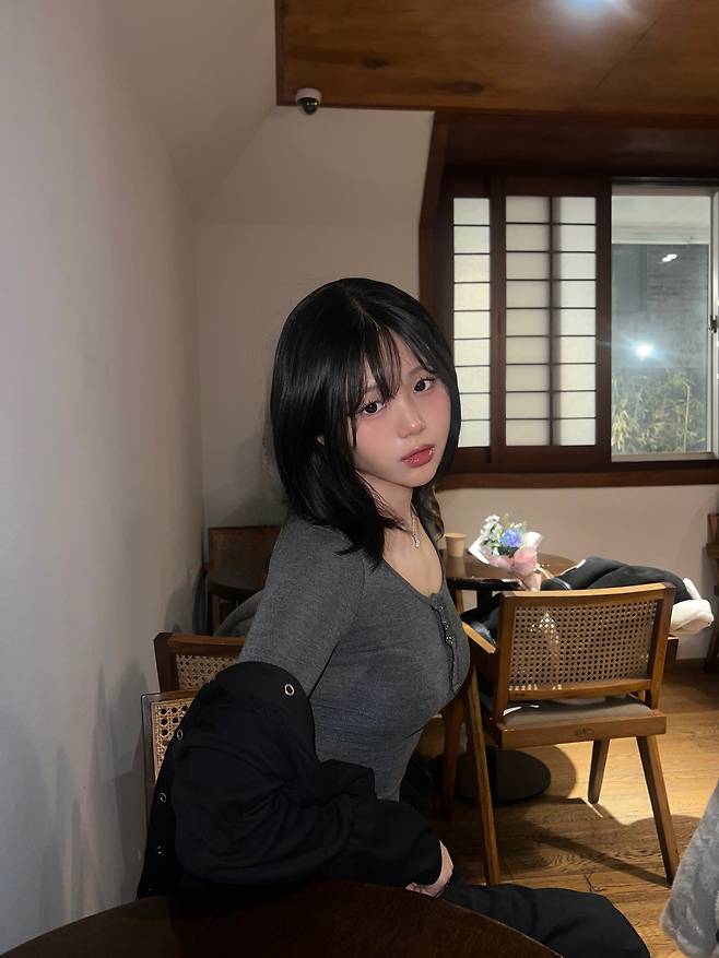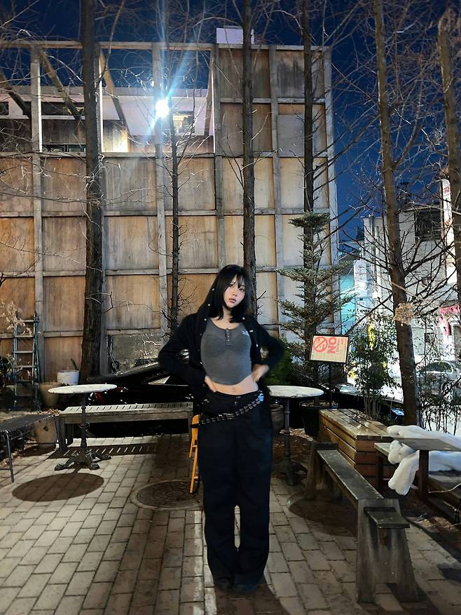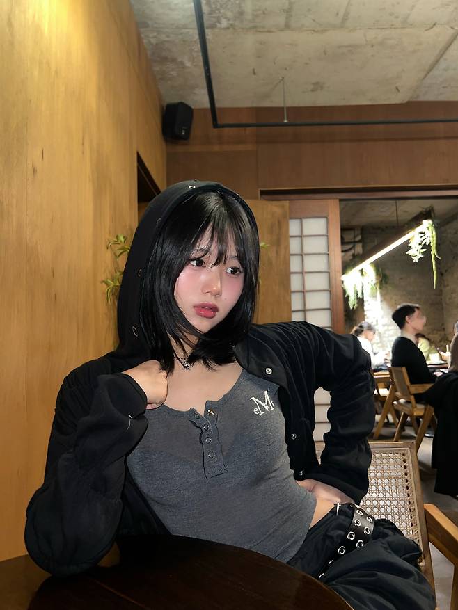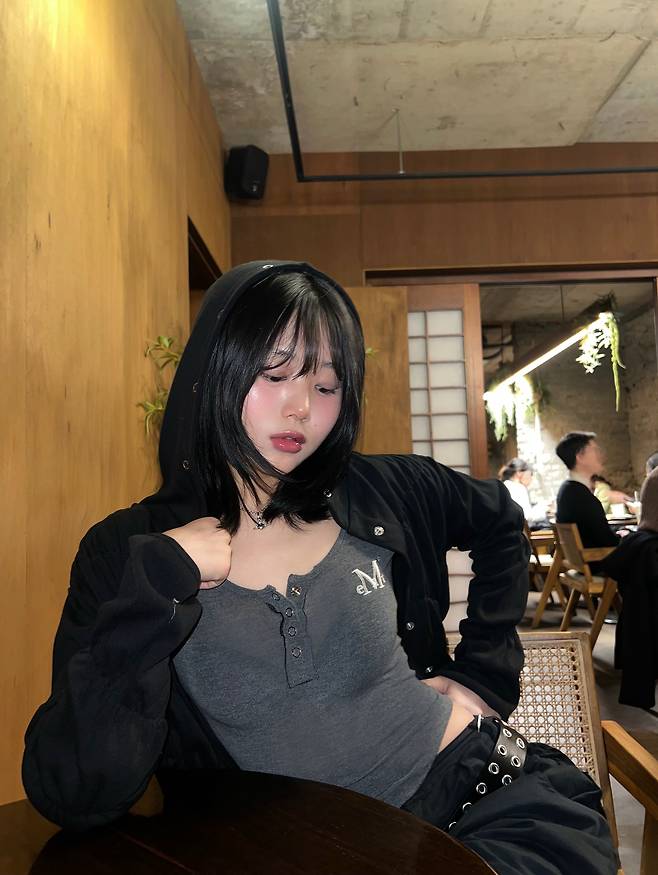 이너는 그레이 티셔츠로 포인트를 주었습니다.