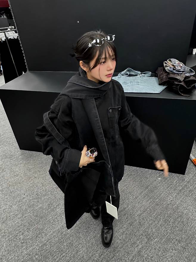 올블랙일수록 단조로워지기 쉬워서 아이웨어에 포인트를 주었어요.