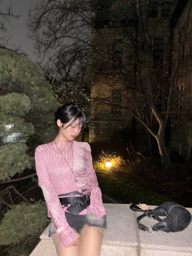 핑크색 니트와 벨트를 활용한 코디입니다.