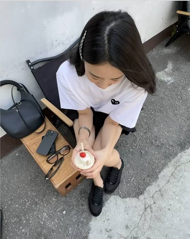 여기에 블랙 스니커즈와 하드한 미니 토트백을 매치하며 '꾸민 듯 안 꾸민 듯' 완벽한 밸런스를 잡아냈습니다.