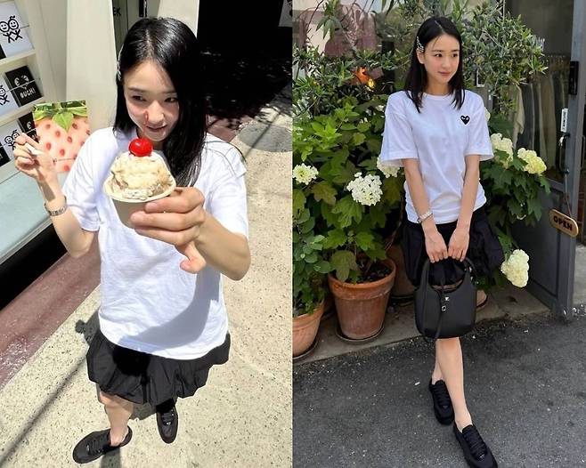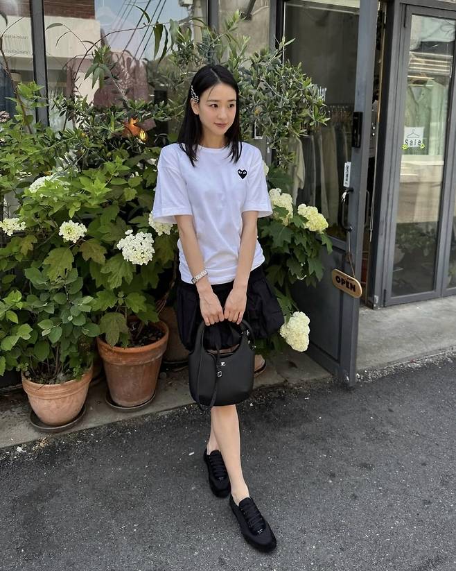특히 티셔츠는 꼼데가르송의 하트 로고가 포인트였으며, 하의는 자연스럽게 퍼지는 실루엣으로 발랄한 무드를 자아냈습니다.
