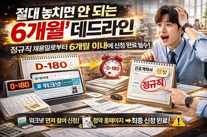 무엇보다 중요한 핵심은 단 하나다.정규직 채용 후 6개월 이내 신청 완료.이 기한을 하루라도 넘기면 신청 자체가 불가능하다.
