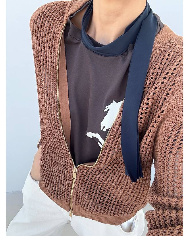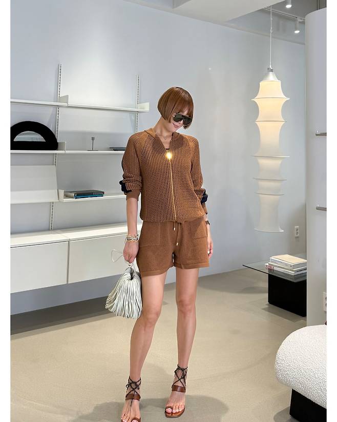 톤다운된 브라운 컬러의 집업 니트와 쇼츠가 한 벌처럼 매치돼 캐주얼하면서도 고급스러운 분위기를 자아내죠.