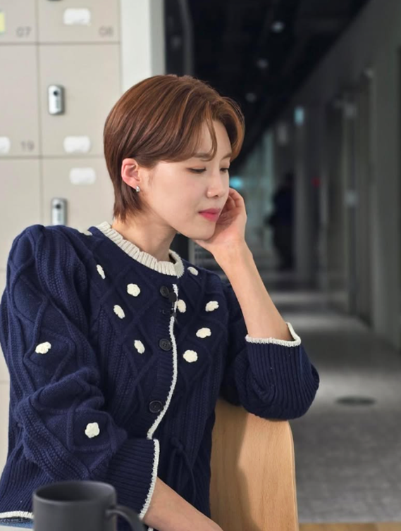 입체적인 짜임과 화이트 플라워 디테일이 더해진 네이비 니트를 착용해 포근하면서도 유니크한 무드를 연출했다.