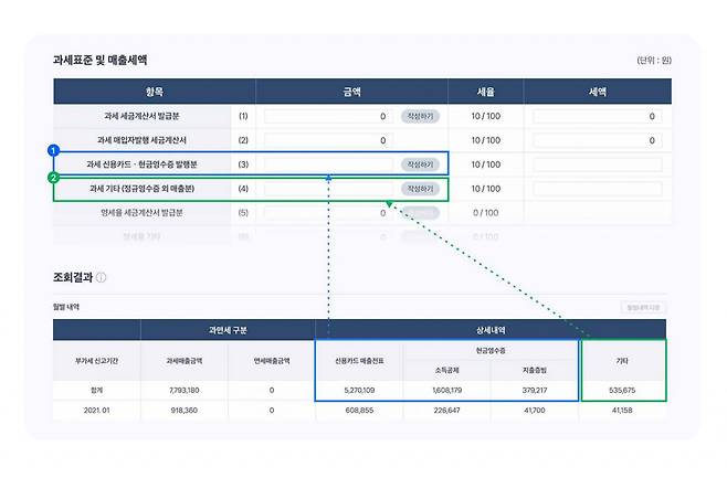 신용카드 결제 내역, 현금영수증 발행 내역은 ‘과세 신용카드 현금영수증 발행분’에, 그 외는 ‘과세 기타(정규영수증 외 매출분)’에 입력하면 돼요.