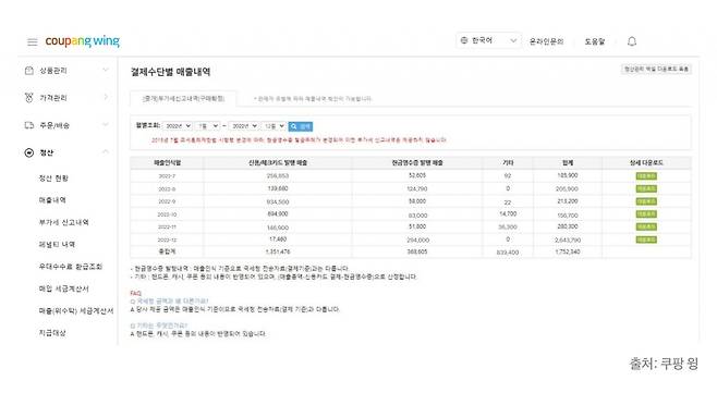 쿠팡의 판매자센터인 ‘쿠팡 윙’에서 부가세 신고 자료 확인이 가능해요.