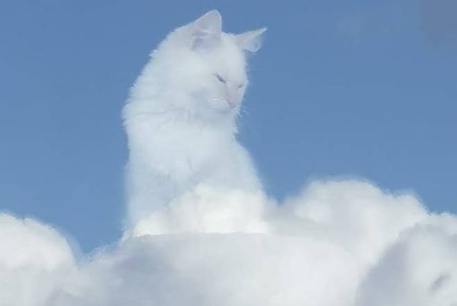 푸른 하늘 위에 두둥실 떠 있는 하얀 뭉게구름. 그런데 그 구름 위에 고양이 한 마리가 마치 왕좌에 앉은 신처럼 위풍당당하게 자리를 잡고 있는 것입니다.