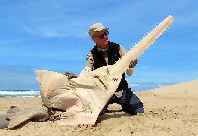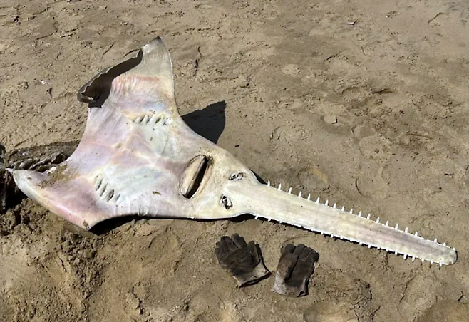 세계적인 희귀종 톱가오리가 남아프리카공화국 하구의 모래사장에서 사체로 발견됐다. 독특한 외형으로 보는 이를 압도하는 톱가오리는 남아공에서는 1999년 이후 목격 사례가 없는 터라 많은 관심이 모였다.