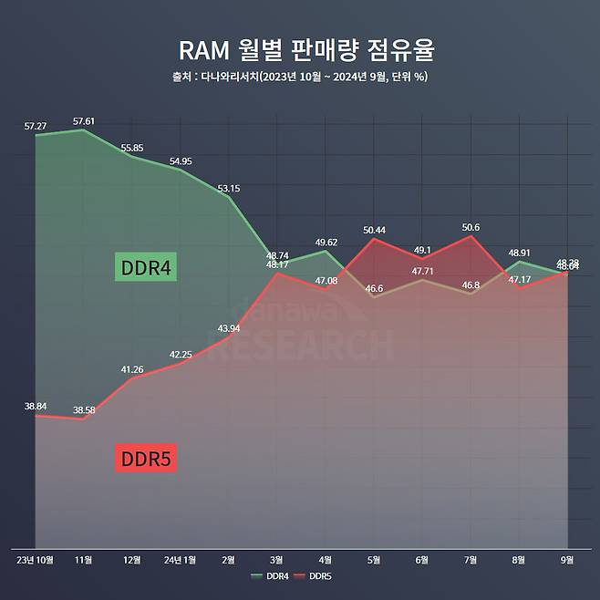 드디어 DDR5 메모리의 판매량이 DDR4 메모리를 넘어서기 시작했다. 2024년 3월을 기점으로 DDR4와 DDR5의 판매량 점유율의 격차가 급격하게 좁아지더니 급기야 5월에는 첫 역전에 성공한 것이다. 그 후 8월 경엔 잠시 DDR4 메모리의 점유율이 상승해 DDR5 메모리를 제쳤으나 격차는 2% 남짓. 메모리 세대의 전환이라는 과도기라는 사실을 위 그래프가 잘 말해준다. AMD든 인텔이든 새로 출시하는 신형 CPU는 DDR5 메모리를 사용하므로 시간이 지날수록 DDR4 메모리는 지속적인 하락세를 보일 것이고 DDR5 메모리는 계속 판매량 점유율을 잠식하게 될 전망이다.