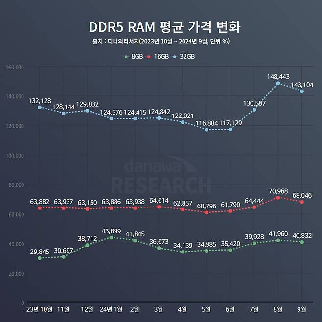DDR5 메모리 가격은 단위 용량 모듈별로 평균 가격 변화 양상이 다르게 나타난다. 8GB 모듈은 1년 전 약 29000원이었다가 현재 4만 원대까지 36%나 급상승한 모습이다. 반면 16GB 모듈은 1년 새 약 5천 원 정도만 올라 어느 정도 안정세를 이루었다고 판단이 가능하다. 32GB 모듈은 등락폭이 커서 혼란기라 여겨지는데, 13만 원대에서 11만 원대까지 내려갔다가 다시 14만 원대로 상승했다. 일반적으로 PC의 메모리는 듀얼 채널로 구성하기 때문에 이런 단일 모듈 가격의 2배로 계산한 것이 실제 소비자가 구매하는 메모리 가격이라 하겠다.