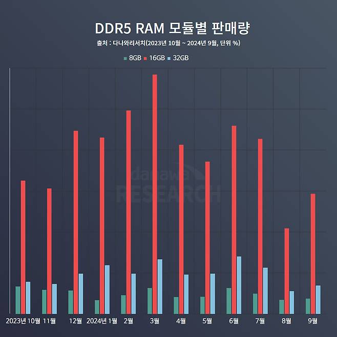 가격 안정세에 힘입어 16GB 모듈의 판매량 점유율은 압도적 차이로 다른 모듈보다 높다. 가장 판매량이 높아 DDR4에 역전의 시작점이었던 2024년 3월엔 16GB 모듈이 8GB 모듈의 거의 10배, 32GB 모듈의 5배 정도 규모였다. 이는 2월에 인텔 Z890, B860 칩셋이 발표되고 3월 AMD A620MS 칩셋이 출시되어 DDR5 메모리의 소비 촉발을 유도한 것으로 보인다. 이후 8월 여름 비수기에 모든 모듈의 판매량이 8월에 급격한 하락세를 보였으나 이내 회복했다.