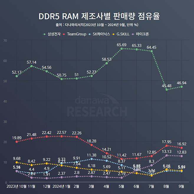 제조사별 판매량 점유율의 변화도 눈에 띈다. 바로 삼성전자의 판매량 점유율이 급격한 하락한 것이다. 그동안 PC 메모리 시장의 가장 기본적인 상징으로 군림했던 삼성전자 메모리가 64%가 넘는 점유율이었다가 2024년 8월을 기점으로 45%대까지 추락했다. DDR5 메모리 출시 이래 가장 낮은 점유율이다. 삼성전자를 제외한 나머지 시장에서 경쟁을 펼치고 있는 팀그룹, SK하이닉스, 지스킬의 판매량 점유율은 5, 6월에 비슷하게 하락했다가 다시 상승세를 찾았다.