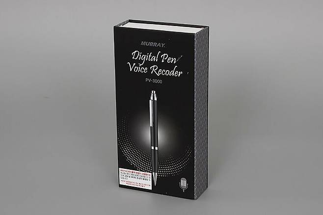 머레이 디지털 펜 보이스 레코더 PV-3000은 검정 바탕의 박스에 담겨있다. 박스 크기는 고급 필기구의 선물용 패키지와 비슷한 크기로, 앞면에 제품 이미지가 인쇄되어 있다. 박스를 열면 본체가 안쪽에 완충재로 비스듬하게 고정되어있다.