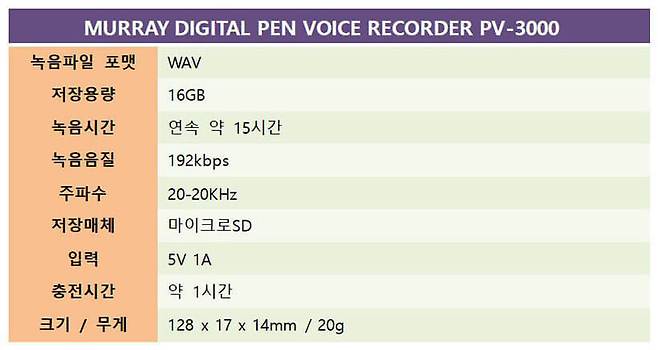 업무상 미팅을 많이 하다 보면 녹음기가 있으면 싶을 때가 반드시 온다. 뛰어난 음질로 녹음과 재생까지 다 되는 스마트폰이 있는데 왜 녹음기가 필요할까 싶지만 스마트폰으로 녹음 도중에 전화가 오거나 다른 용도로 사용하게 되면 녹음을 방해할 수도 있고, 스마트폰을 꺼내기 불편한 상황도 있기 때문에 별도의 보이스 레코더가 있으면 훨씬 편리하다. 강의를 듣는 학생들도 중요한 강의 내용을 다시 확인하기 위해 녹음을 하는 경우가 있는데, 이때도 마찬가지로 전용 보이스 레코더를 사용하는 것이 더 낫다. 머레이 디지털 펜 보이스 레코더 PV-3000은 필기구와 녹음기를 합친 제품으로, 자체 재생 기능까지 모두 갖추고 있다.