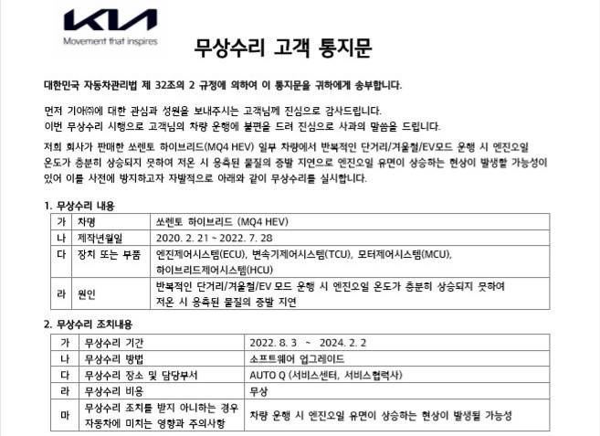 기아는 2일 '무상 수리 고객 통지문'을 발송하고, 엔진오일 증가 현상이 나타난 쏘렌토 하이브리드(MQ4 HEV)에 대한 무상 수리를 공지했다. 대상은 2020년 2월부터 2022년 7월까지 생산된 쏘렌토 하이브리드(MQ4 HEV) 전량이다.