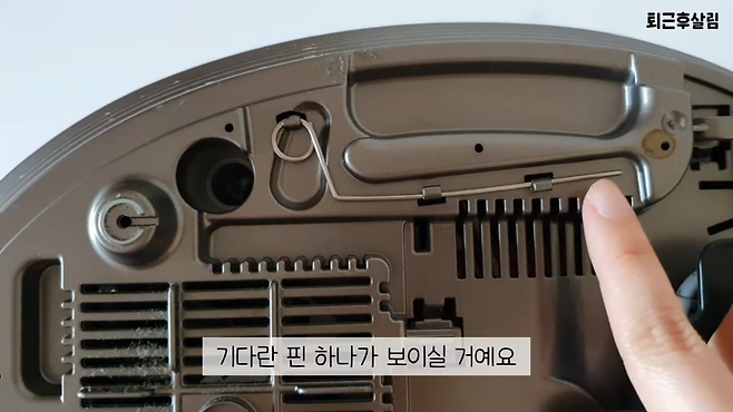 밑바닥 한 쪽 면에는 이런 기다란 핀 하나가 보이실 거에요. 이건 증기배출구 전용 청소용 핀인데요. 압력추를 뺀 작은 구멍에 이 핀을 넣어 위 아래로 움직여 주세요.