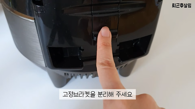 밥솥을 돌려 뒤 부분의 물 받침대와 고정 브라켓 분리해주세요. 틈새가 좁은 물 받침대는 면봉에 식초를 묻혀 애벌 세척해준 후 마무리로 칫솔을 이용해 다시 한 번 틈새 공간을 헹궈줍니다.