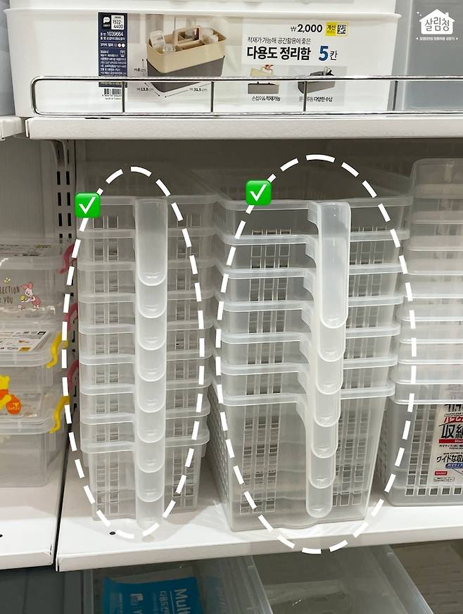 상부장 선반은 너무 높아서 주방 수납 정리를 하기 애매하잖아요. 그럴 때, 이 손잡이 리빙박스를 활용하면 딱이라고 하더라고요 ✔️