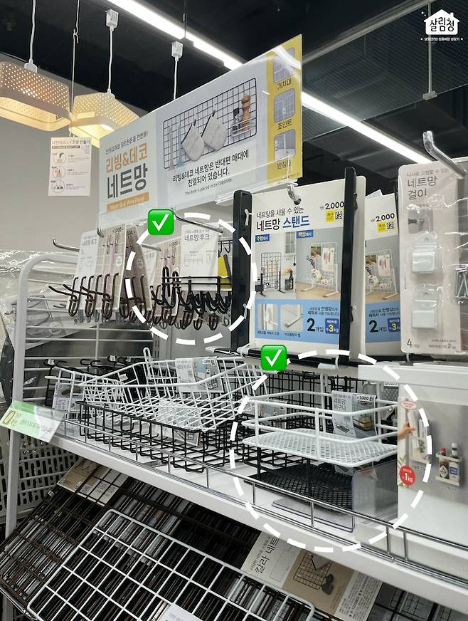 다이소 네트망은 바구니와 걸이를 함께 사용할 때 활용도가 높아져요! 1000원~2000원 대에 다이소에서 함께 구매할 수 있답니다 👍