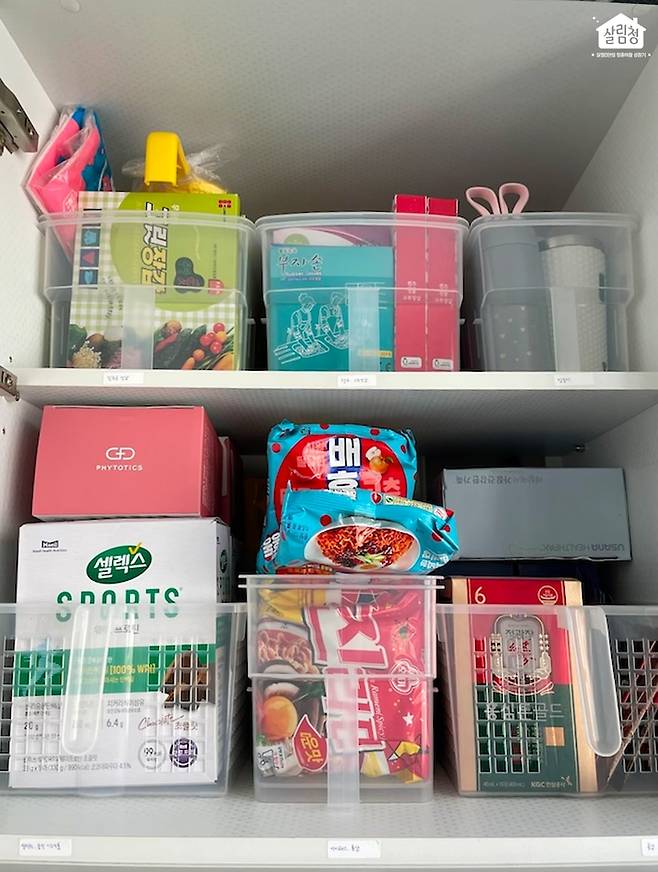 상부장 선반은 너무 높아서 주방 수납 정리를 하기 애매하잖아요. 그럴 때, 이 손잡이 리빙박스를 활용하면 딱이라고 하더라고요 ✔️