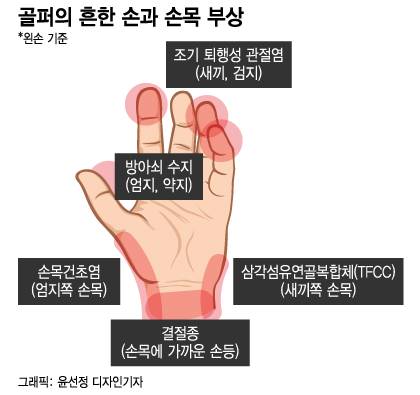 손과 손목 부상은 오른손잡이는 왼손, 왼손잡이는 오른손에서 잘 나타난다. 빨리 치료할수록 손상도 덜하고 치료 기간도 짧아져 조기 대처가 중요하다. 서 센터장은 "골프를 칠 때 손이 아프면 무조건 쉬어야 한다"면서 "일주일 이상 같은 부위에 통증이 나타나거나, 똑같은 행동을 할 때마다 증상이 심해지면 정밀 검사를 받는 게 바람직하다"고 조언했다. 중앙대병원에서 시작해 부민병원까지 수백 명의 스포츠 부상을 책임진 서경묵 센터장이 골퍼를 괴롭히는 대표적인 손·손목 부상 다섯 가지를 꼽았다.