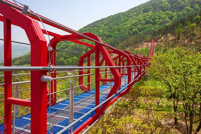 무릉교는 환상적인 경치가 펼쳐지는 무릉 계곡을 거닐 수 있는 출렁다리입니다. 수려한 자연이 있는 왕산과 동의보감촌의 풍경을 마음껏 누릴 수 있는 곳입니다. 육각형 구조물 70개를 터널처럼 연결한 독특한 곳입니다.
