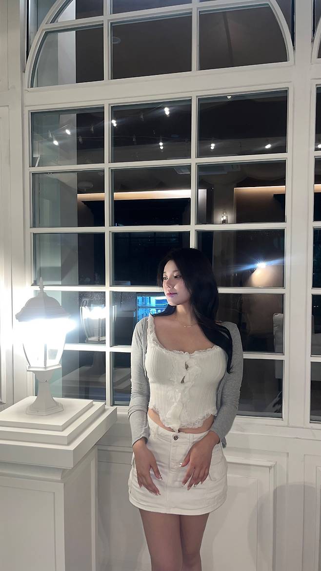 하의는 화이트 데님 미니스커트로 매치해 전체적인 룩을 정돈했어요.