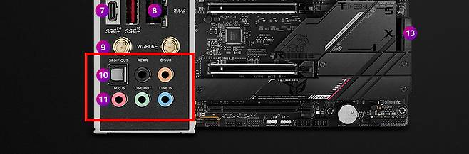 역시나 돈의 힘이 강한 분야다. 2-30만 원대 이상 고급 메인보드 정도는 되어야 검은색으로 표시된 RS-OUT, 즉 후방 서라운드 채널과 주황색으로 표시된 CS-OUT, 즉 중앙 스피커와 서브 우퍼 채널 출력 단자를 제공한다. 따라서 사운드 카드를 구입하지 않고 5.1 채널 이상 서라운드 사운드를 연출하려면 PC를 구입할 때 메인보드에 더 투자를 해야 한다는 말이다.