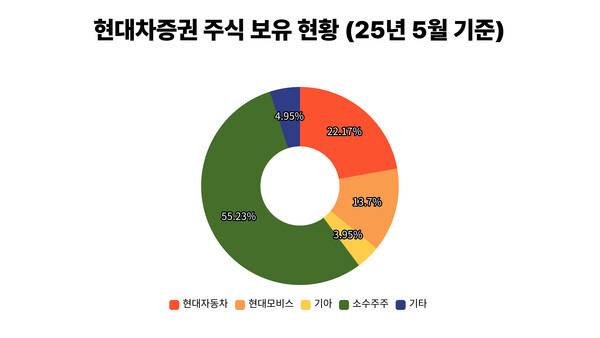 8일 금융감독원 등에 따르면 현대차증권 주주 현황을 살펴본 결과 현대자동차그룹 계열사들이 다수의 지분을 확보하고 있다. 5월 기준 최대주주는 현대자동차로 전체 지분의 22.17%를 보유하고 있다. 또 현대모비스가 13.7%, 기아가 3.95%를 가져 그룹 계열사 보유 지분을 모두 합치면 약 40%에 달한다. 반면 소수주주의 지분은 약 50% 수준이라고 전해졌다.