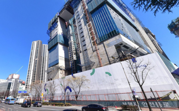 포스코이앤씨는 2022년 12월 착공에 들어가 내년 1월 준공 목표로 공사를 진행 중이다. 도급액은 3286억원이며 1월 말 기준 공정률은 53.7%이다. 본PF에 책임준공을 약정하며 대출 성사를 도왔다.