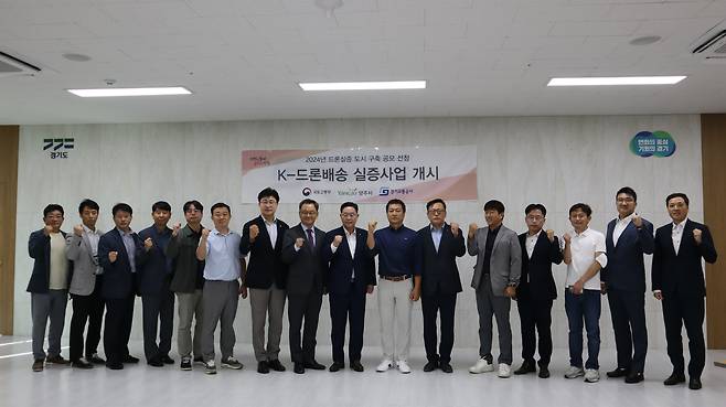 | ▲ 민경선 경기교통공사 사장, 강수현 양주시 시장, 드론 배송업체인 ㈜비씨디이엔씨 등 컨소시엄 협력사들과 경기도의회 이영주 의원 등이 27일 경기교통공사 본사에서 열린 드론 배송 시연회에 참석해 기념 촬영을 하고 있다. |