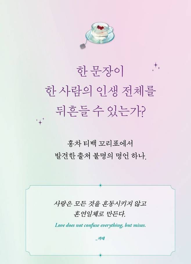 주말 오후, 스마트폰 속 명언들은 잠시 꺼두고 이 책을 펼쳐보자. 어쩌면 당신도 당신만의 '티백 문구'를 발견하게 될지도 모른다. 물론, 출처가 괴테가 아니더라도 상관없다. 당신의 삶을 울렸다면, 그것은 이미 위대한 문장이니까.
