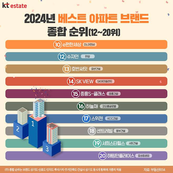 한편, 부동산R114에서도 2003년 이후 매년 ‘베스트 아파트 브랜드’ 종합 순위를 발표하고 있습니다. 지난해의 경우, 전국 성인 남녀 5445명을 대상으로 설문조사를 한 결과, 등수를 1위부터 20위까지 나열했는데요.