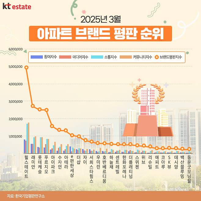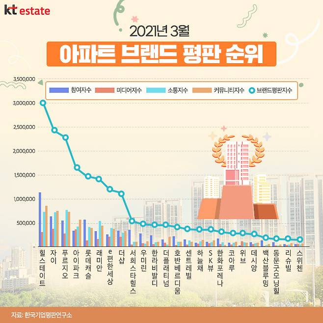 아파트에도 등수가 있습니다. 다양한 기관에서 매달, 혹은 매년 아파트 브랜드 순위를 집계해 발표하고 있는데요. 그중에서도 한국기업평판연구소는 매월 아파트 브랜드에 대한 평판지수를 집계해 순위를 매기고 있습니다.