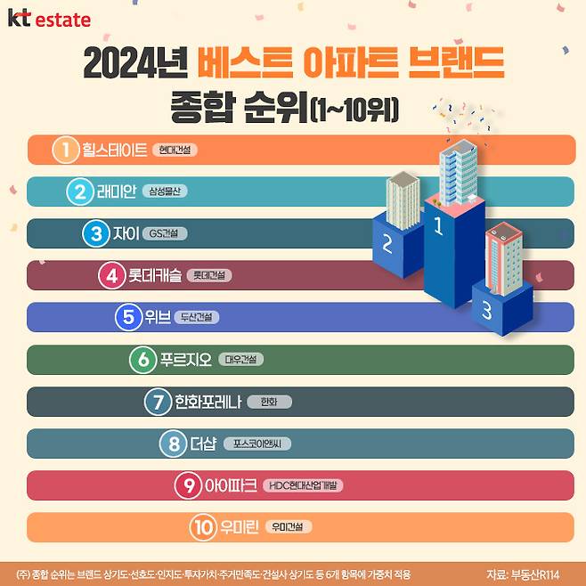 해당 조사에서도 1위는 역시나 힐스테이트로 나타났습니다. 뒤를 이어 래미안이 2위를, 자이가 3위를 기록했습니다. 다음으로 4위는 롯데캐슬, 5위는 위브가 차지했으며, 푸르지오가 6위, 한화포레나가 7위, 더샵이 8위, 아이파크는 9위, 우미린과 e편한세상은 공동 10위로 선정됐습니다.