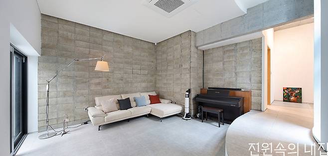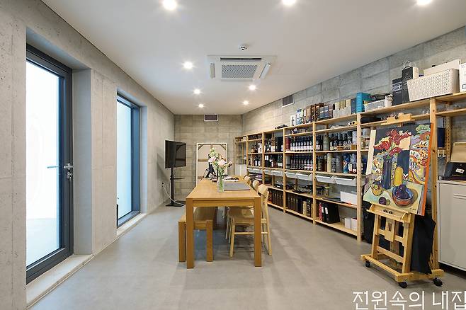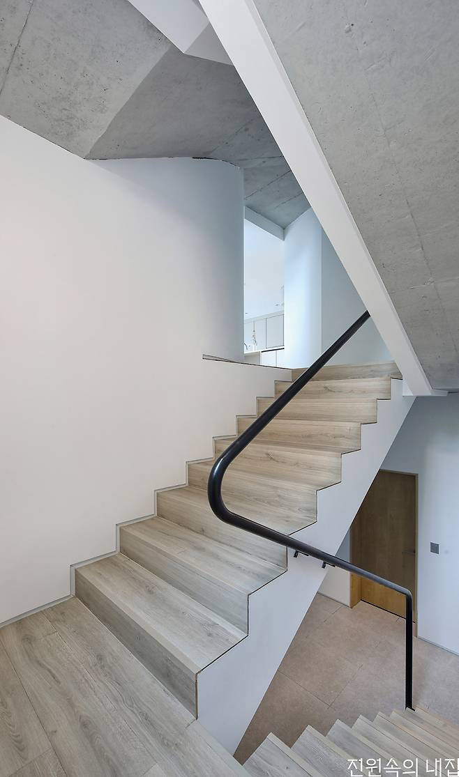 앞서 설명한 방식으로 실을 구성하고, 합리적이면서 전체 공사비의 증가가 많지 않도록 내장재를 선택하였다. 노출된 배관이 없거나 마감재를 부착하지 않아도 되는 부위는 골조 그대로를 마감으로 사용하였고, 지하층에 4인치 시멘트 블럭을 쌓아 만든 방습벽 부분은 기능이 그대로 마감이 되도록 하였다. 벽체가 일부 돌출되도록 계획한 것은 기능적인 역할도 있지만, 조형의 완성을 위해 고집한 부분이기도 하다. 또한, 계단 난간은 부재를 최소화하고 본질만 남기고자 하는 의도로 계획하였으며, 책을 가까이 두면 조금이라도 더 책을 읽는 경험이 만들어질 것이라 생각하고 매일 오르내리는 계단벽 전체를 책장으로 계획하였다. 건축 의도를 그대로 구현할 수 있었던 특별한 경험이었고, 계획에 우선하였던 사항들을 잘 지키면서 건축을 완성할 수 있어서 좋았다. 오랫동안 꾸준히 가꾸면서 채워나갈 수 있으면 좋겠다.