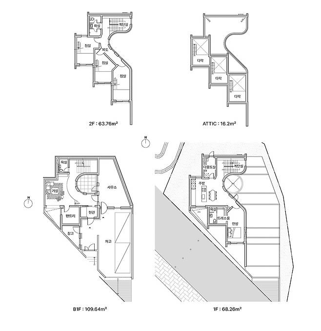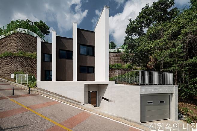 이 윤곽 내에서 1층에는 안방과 주방·식당, 다용도실을 배치하였고, 거실은 지하층에 배치하며 2개의 선큰 공간을 만들어 지하층에 자연광이 충분히 유입되도록 하였다. 지하층은 북측의 옹벽으로부터 충분히 이격시키면서 적절한 면적이 되도록 하였다.자연스럽게 건축의 주요한 형태로 적용된 벽체를 강조하기 위해 동측, 서측 입면은 외단열시스템 STO로 마감된 백색 벽으로 계획하고 창을 최소화하였으며, 남측, 북측 입면은 이와 대비되는 유토社의 짙은 회색 테라코타 타일로 마감하였다.