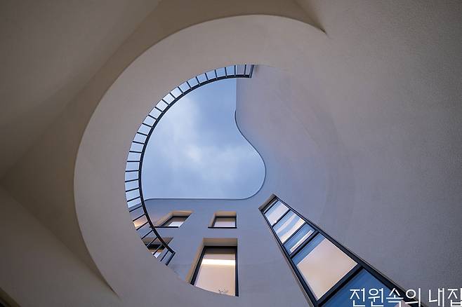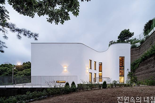 학교 언덕길에 눈길을 모으는 집 한 채. 곡선을 품고 새하얀 날개를 달아 땅을 읽어내 얹은 다섯 식구의 집에는 건축가가 가족을 위해 쏟아낸 치열한 고뇌가 담겼다.