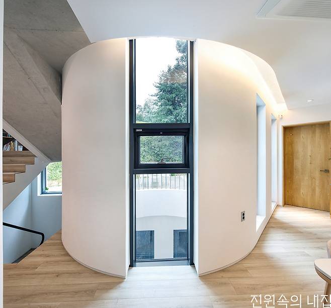 아이들 3명이 각각의 방을 가지며 가급적 동일한 규모의 방을 만드는 것이 우선이었다. 2층에 아이들의 방을 공원이 내려다보이도록 남서쪽 도로에 가깝게 남향으로 배치하였다. 건폐율이 20%인 자연녹지에서 3개의 방과 계단, 화장실을 계획 가능한 면적 내에 배치하는 것이 주안점이었다. 대지의 형태에 따라 방을 배치하고 이를 가장 적은 면적의 복도로 이어주면서 곡선을 적용하였고 서측의 도로에서 실내가 들여다보이는 것을 최소화하기 위해서 벽체를 조금씩 연장하였다. 이것이 수직의 벽으로 만들어지며 건축의 주요한 외관을 만들어냈다.