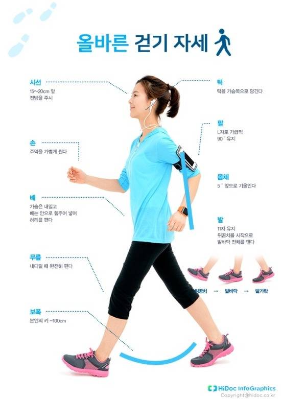 올바른 걸음걸이는 체중을 고르게 분산시켜 무릎 한 부분에 집중되는 압력을 줄입니다.