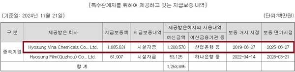 효성화학이 베트남법인 대신 차입금을 갚아주기로 한 지급보증 잔액은 지난해 11월 21일 기준 1조8856억원에 달한다. 이번에 차입금을 상환하면 지급보증 금액도 크게 줄어들 전망이다.