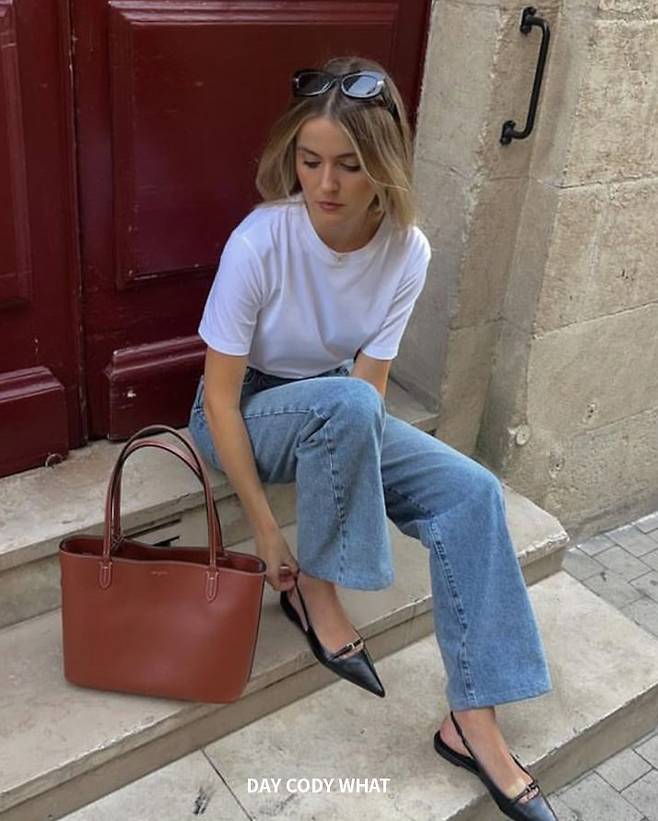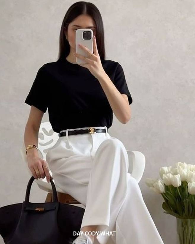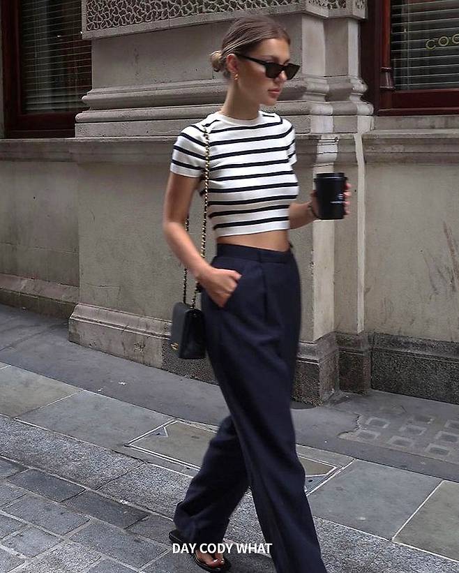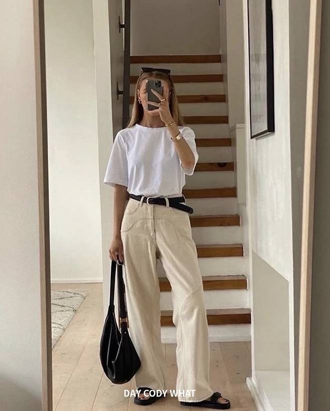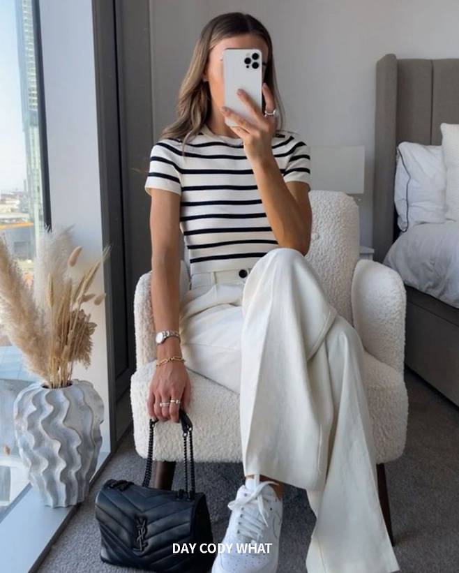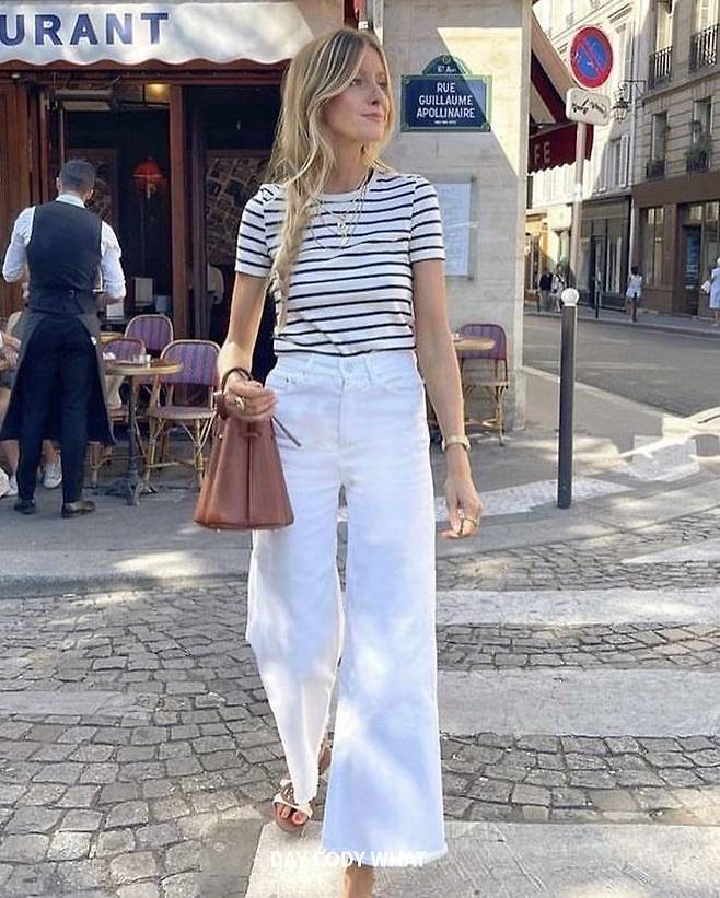 3.스트라이프 패턴 반팔 + 흰색 / 아이보리색 와이드 팬츠