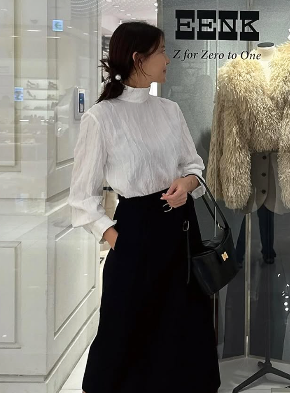 여기에 블랙 롱스커트를 매치해 모던하면서도 클래식한 분위기를 완성했다.