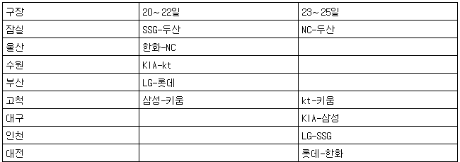LG는 인천 SSG랜더스필드에서 SSG와 주말 3연전을, 9위 두산은 NC와 잠실구장에서 홈 3연전을 각각 벌인다.