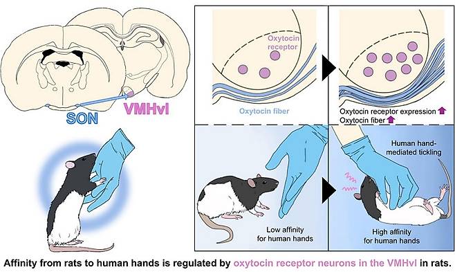 이어 "옥시토신이 관여하는 시상하부의 신경회로가 쥐와 놀이를 통해 사회적 유대를 촉진하는 구조로 변화했다"며 "인간이 쓰다듬은 쥐는 시상하부 복내측핵 복외측부(VMHvl)에서 옥시토신의 수용체가 활성화됐다"고 강조했다.