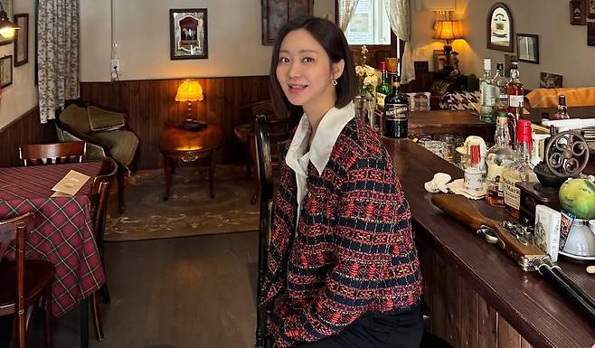 한그루가 선택한 스타일은 큼직한 화이트 칼라가 돋보이는 레드×블랙 트위드 카디건이다. 촘촘한 짜임 사이로 골드 버튼이 반짝이며, 은은한 빛이 어우러지는 실내 분위기와도 완벽한 조화를 이룬다. 고전적인 디테일과 섬세한 패턴이 어우러져 그녀의 우아하면서도 성숙한 매력을 드러냈다.