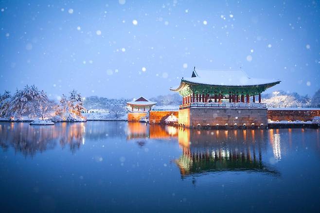 특히 저녁에는 조명이 비추는 궁궐과 연못이 만들어내는 아름다운 반영을 볼 수 있어, 겨울 야경을 즐기기에 안성맞춤입니다. 연못에 비친 설경과 달빛을 즐기며 사색에 잠겨보세요.