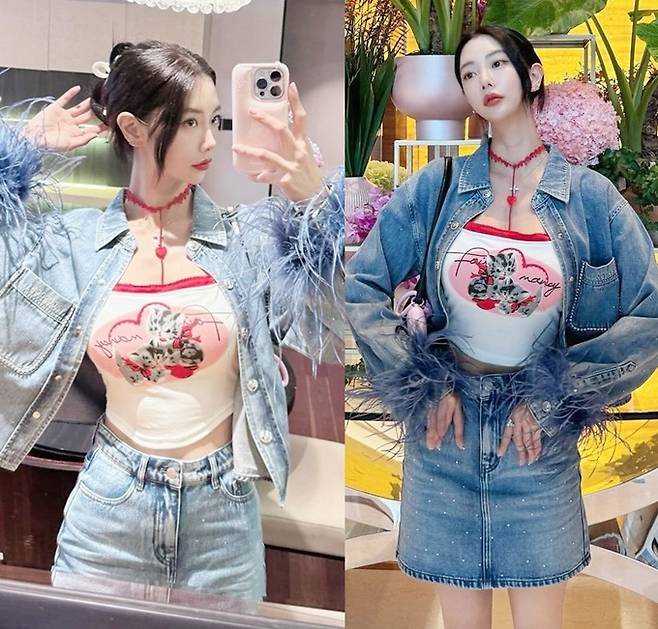 공개한 사진에서 클라라는 복근이 살짝 노출된 고양이 캐릭터 크롭 티셔츠에 데님 미니 스커트와 데님 크롭 재킷의 청청패션으로 10대 소녀 같은 걸리시룩을 선보였다.