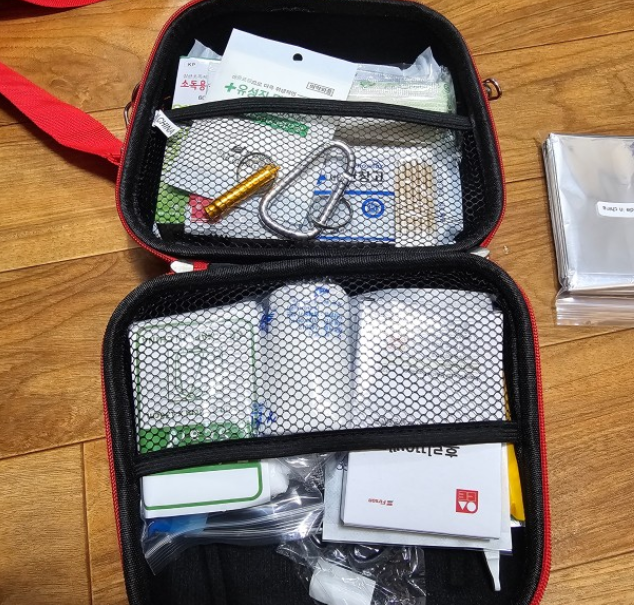 키트에는 붕대, 소독약, 반창고 등의 기본적인 응급처치 용품이 포함되어 있어야 합니다.