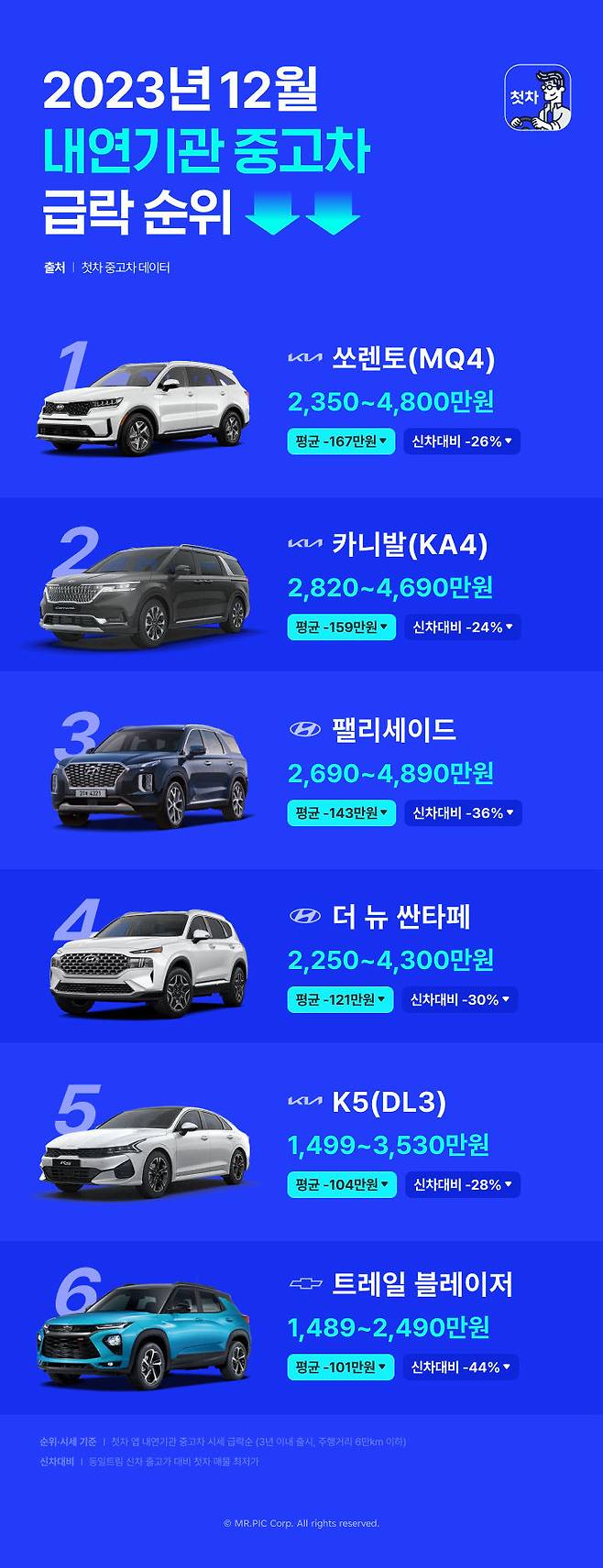 첫차의 ‘2023년 12월 주요 중고차 시세와 판매 순위’에 따르면 3천만원 이상 대형 SUV, 특히 인기 모델인 쏘렌토(MQ4)의 가격 하락이 두드러졌다.